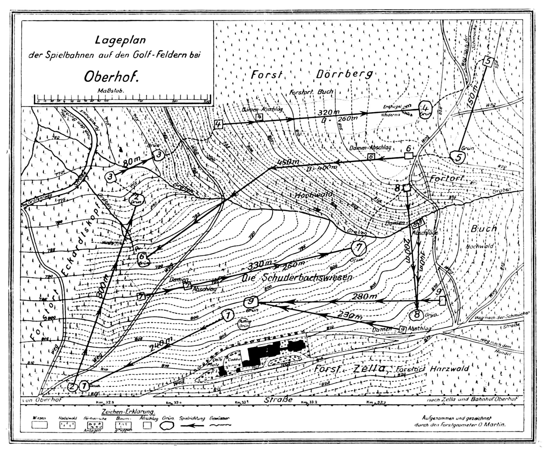 Eine herrliche Hanglage, im Winter bevorzugt von Skifahrern und Rodlern genutzt. Der Steilhang im Südosten wird bevorzugt als "Idiotenhang" von den Anfängern genutzt. Einzelne Baumgruppen lockern die Fläche auf. Ein unverwechselbares Bild bietet diese Wiese, wenn man von der parallel verlaufenden B247 hinunter auf das Grün schaut. 1909, nach 2 Jahren Planung und Bauzeit, wurde der Platz erstmals als Golfareal mit 9 Löchern bespielt.